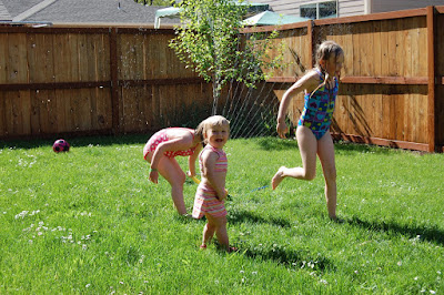 It is so beautiful out today, so I thought I would get the sprinklers out for the girls to play in! And don't mind my un-mowed yard. My hub is incredibly sunburned from working in his parents yard yesterday, and he just did not feel like working in our yard today. I don't blame him!